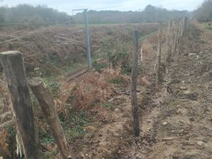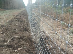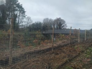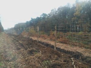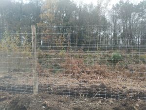 Afin d’assurer cette sécurisation nous avons réalisé des clôtures gibier type cervidé, en collaboration avec l’entreprise Dirickx. Cette clôture présente donc des poteaux en acacia et un grillage renforcé. L’ouvrage est de 1m80 hors sol, mais présente 50 cm supplémentaires enterrés afin d’éviter le franchissement du gibier même si celui-ci vient creuser en bordure de l’ouvrage.